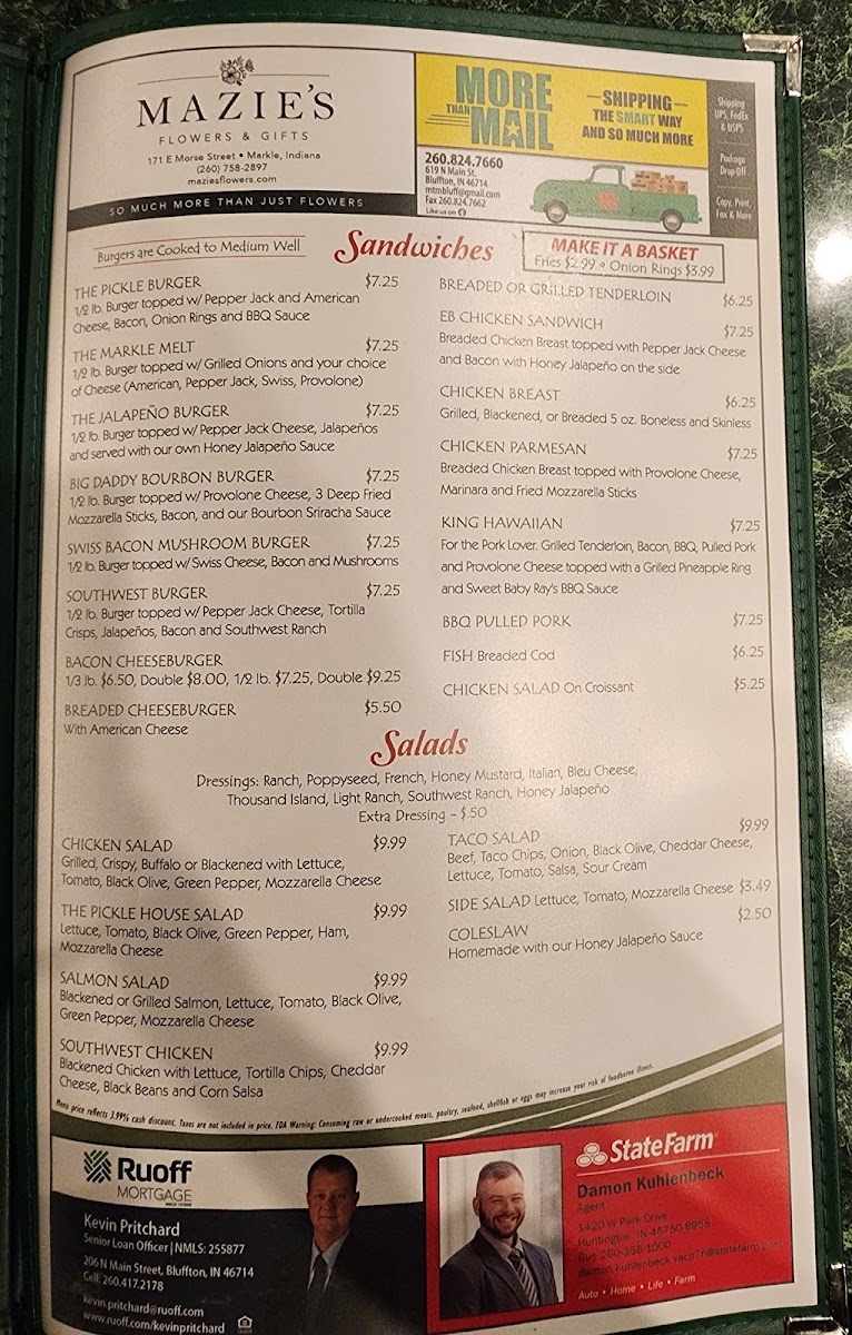 Sandwiches and Burgers: This section includes a variety of burgers like The Pickle Burger, Big Daddy Bourbon Burger, Jalapeño Burger, and Swiss Bacon Mushroom Burger, as well as chicken sandwiches such as Chicken Parmesan and Breaded or Grilled Tenderloin options. Each sandwich item is paired with different toppings and preparation styles to accommodate varied preferences.