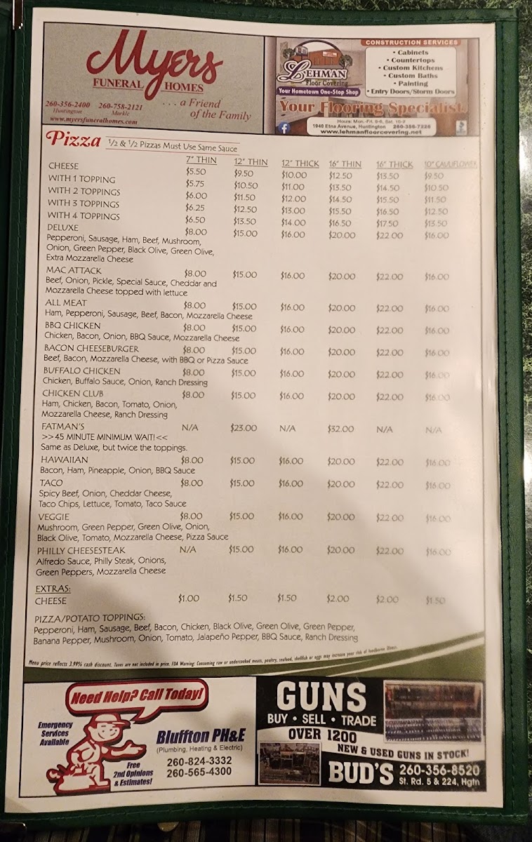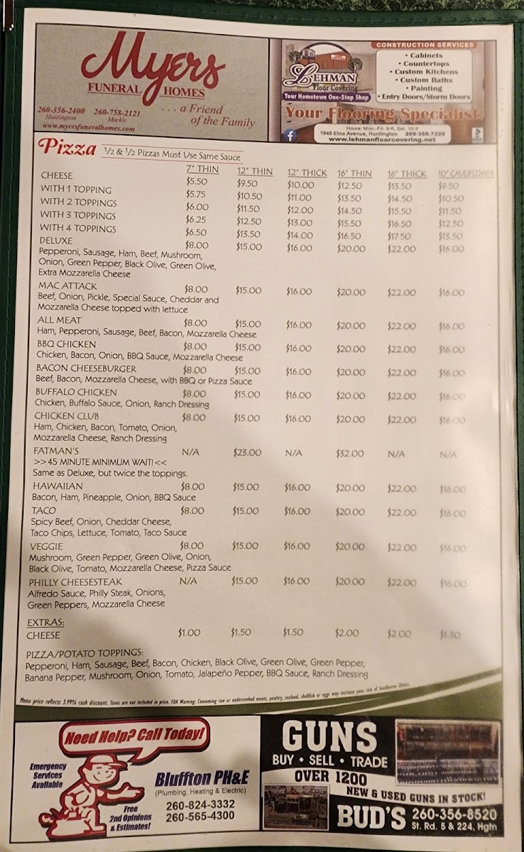 Pizzas and Appetizers: The pizza selection includes thin crust and specialty pizzas like the Thin Crust Philly Steak Pizza and Big Mack Pizza. Appetizers feature fried options such as Fried Spicy Wings, Pickle Potatoes, Onion Rings, House Chips with Jalapeno Dip, and breaded items including tenderloins and fish dishes.